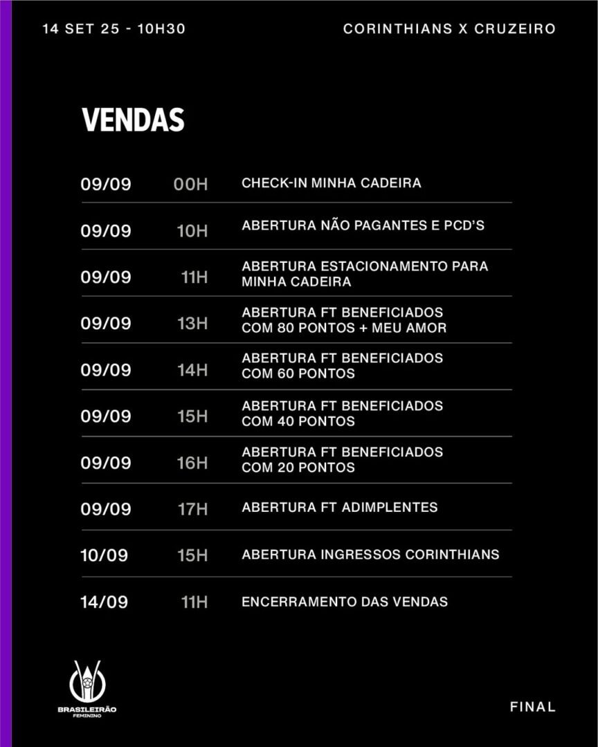 Corinthians inicia venda de ingressos para a final do Brasileirão Feminino contra o Cruzeiro; entrada terá reconhecimento facial obrigatório